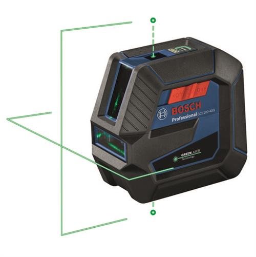 The Bosch GCL100-40G Green Beam Self-Leveling Cross-Line Laser with Plumb Points uses green-beam technology, which emits green lines and points up to 4X brighter than standard red beams.